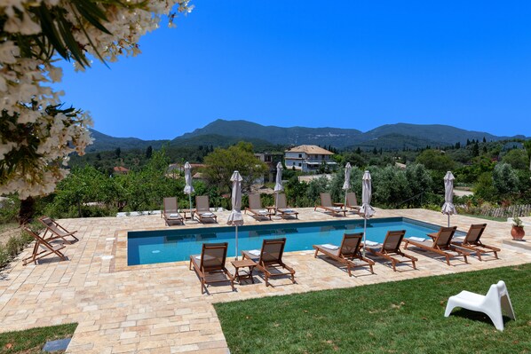 It has a wonderful private and gated garden overlooking the Corfu hills with free-safe parking 1.000 square meters