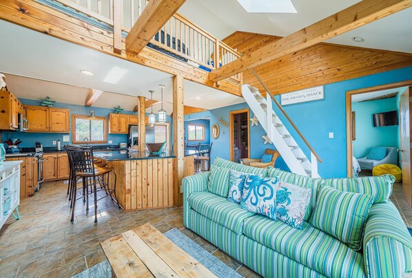 Mid Level: Great Room with 55" Dish TV (Smart TV) with sound bar, Deck Access, Queen Sleeper Sofa, Kitchen w/Stainless Steel Appliances, Large Center Island Seats 8, Pub Table Seats 4. Bedroom with King with TV, shares Full Jack and Jill Bath with 2 Twin bedroom with TV, Bedroom with Queen with TV, Full Hall Bathroom.