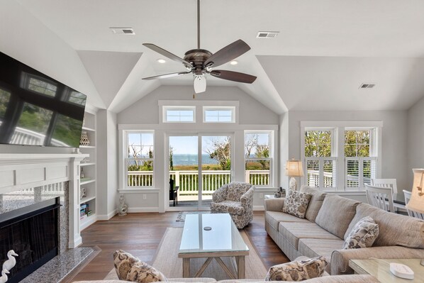 Smart TV, fireplace - Jewel of the Sound: Private Pier | Private Pool & Hot Tub | Elevator | Dogs OK (Corolla)