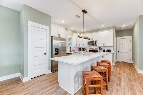 When you arrive, you can park your vehicle in the driveway and/or garage and step into the main level of the home which was designed for gathering with an open concept floor plan. The kitchen is equipped and well stocked with extra dinnerware, glassware, and silverware, plus everything needed for your cooking, baking and storage needs.