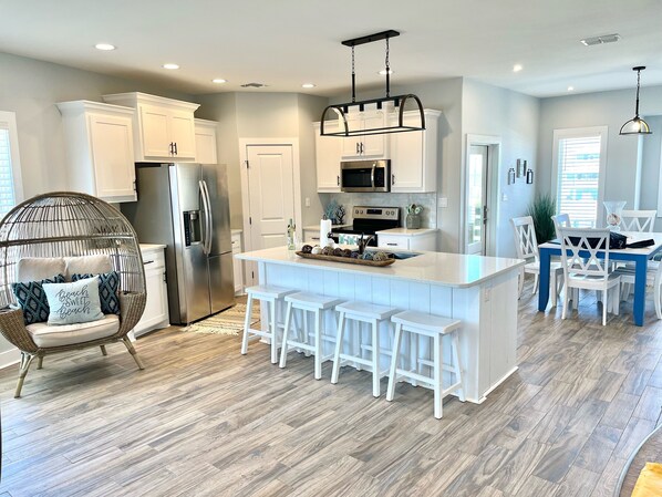 The upstairs kitchen and dining space touts modern upscale elegance with soft touch cabinets, matching stainless appliances, a large island snack bar with extra deep split sink, and Quartz countertops throughout the home. This home features appliances such as Keurig K cup coffee maker for mornings on the go and a Margarita machine as a fun alternative adult beverage maker...you supply the mix and alcohol! There is a spacious dining area with table and chairs for 6, as welll as, 4 barstools at the island bar. Sea Haven is stocked with lots of kitchen extras: Toaster, blender, beverage server, large crab pot, spaghetti strainer pot, nonstick copper frying pans, cookware, and baking sheets. The bay, pool, and lagoon can be viewed from the dining area.