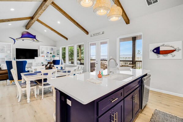 Inside, the bright, open floor plan combines the living room, dining area, and sleek kitchen. The chef will love whipping up favorite recipes with the help of a full suite of stainless steel appliances - plus a wine fridge - and a vast prep space on the standalone island. Sit down for a meal together at the dining table, grab a quick snack at the island, or dine alfresco on the deck before heading out. Don't feel like cooking? Head just down the street to the Crab-N Restaurant for dinner and cocktails.