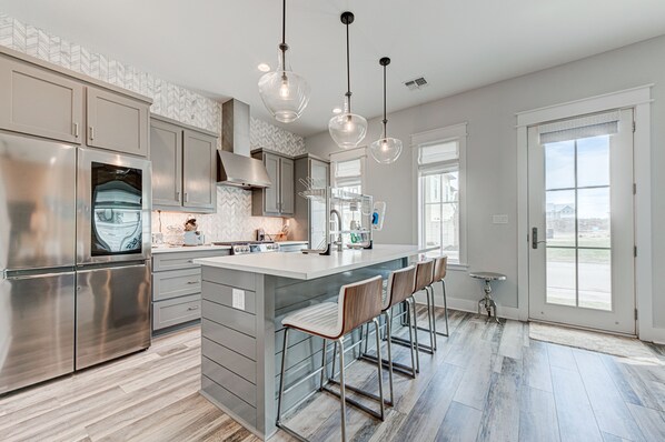 Step inside to discover luxury details, plush furnishings and a spacious design that lets everyone spend time together while allowing for plenty of space to sprawl out. You'll immediately notice the gourmet kitchen. When you aren't out on the town savoring a delicious seafood dinner at one of Port A's restaurants, you'll have this stunning kitchen right at your fingertips. Stainless-steel appliances, a gas range and a working kitchen island make light of any recipe in your arsenal. All you need to bring along are the ingredients! Dine together at the glass-topped sculpture table or head outside and catch the sunset for an Alfresco dinner experience. After dinner, gather on the plush, blue velvet-wrapped sofa for a movie or game night, or head upstairs to the second living room where you'll find a wet bar with a perfect-temp wine fridge just waiting for you to pour a nightcap. Enjoy it on the balcony, under a Texas sky full of twinkling stars.