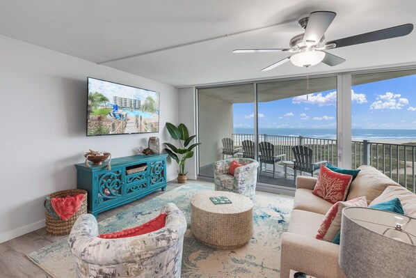 The living area is situated perfectly in front of this condo's magnificent wall-to-wall windows. Catch an early sunrise with your favorite cup of coffee or tea on the love seat or swivel chairs. For the kiddos or additional travelers, the love seat transforms into a queen sleeper sofa for up to 2 more guests. Catching a family-favorite movie from the Smart 70" flat screen television can be done effortlessly as guests are able to input their own logins from their personal streaming accounts. Take in the breathtaking scenery each time you venture through the sliding glass doors and onto your very own private balcony with gorgeous, endless beach views.
