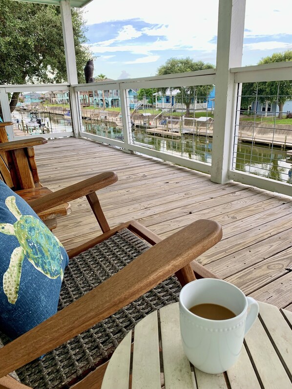Start your mornings by savoring a cup of coffee on the expansive back deck, allowing the refreshing bay breezes to rejuvenate your senses. Whether you're working remotely on your laptop in the shaded breezeway or simply soaking up the sun's rays, this tranquil environment is the ideal backdrop. As the day winds down, after a thrilling day at the beach or a successful fishing adventure, indulge in relaxation on the spacious ground floor covered deck. Fire up the grill for a delicious outdoor meal or cast a line off the dock before retiring to bed.