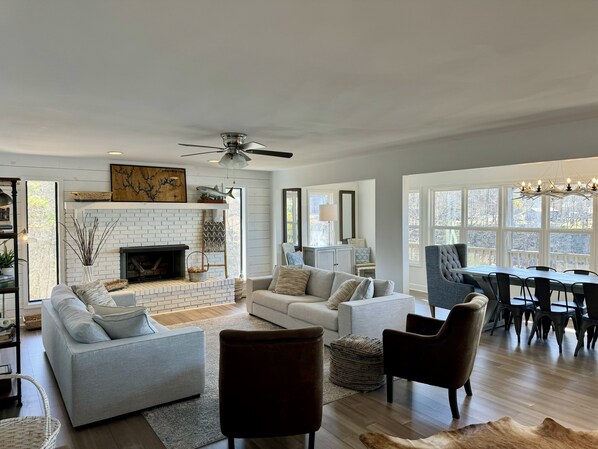 ✔ Living Room – Open floorplan and amazing views over the lake, 2 oversized couches with lots of seating, gas fireplace