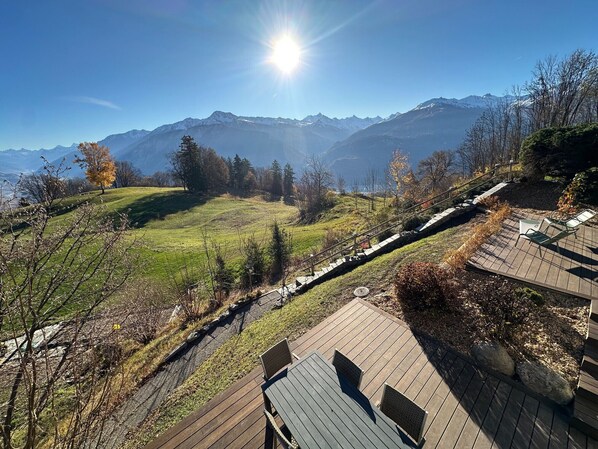 This large living room offers an absolutely unobstructed and breathtaking view of the Swiss Alps and opens onto a large south-facing terrace to enjoy an absolutely unique panorama, with barbecue in summer.