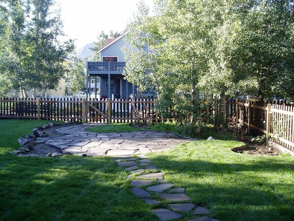 The duplex's shared backyard is fenced and nicely landscaped with flowers and mature aspen trees, as well as a flagstone walkway & patio seating area for summertime visitors. Pet friendly...the large grassy area is perfect for our four-legged visitors!