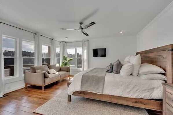 Absolutely beautiful! Just got back from a long weekend stay with family and friends. The house is more spacious than the pictures reflect. Master bedroom has a wonderful mattress. Plenty of space in the bedroom, bath and closet. The kitchen is small but had everything we needed, and the island and shelving rack provided extra space. The downstairs was perfect for our kids. It has a surround sound system that was great for their music and dancing. Outside is the gas firepit. We used it for s'mores a couple of nights. Seating was great. The dock was wonderful! We used everything the owner graciously provided. It has a very large lily pad, 2 kayaks, 2 stand up boards and several floats. The water is deep which was perfect for jumping off the dock. 10 of us went and not one single complaint. It had everything we were looking for in a lake house rental and plenty of things that entertained the kids. One more note....it was exceptionally clean!! We would definitely stay here again.