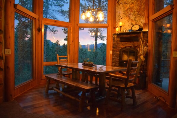 Our Grill is on cement deck, (there are 5 decks, each with a gorgeous view!) Beautiful, custom built blue-stained pine dining table sits in front of the wood fireplace with a grand view of the Black Elk Wilderness.