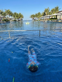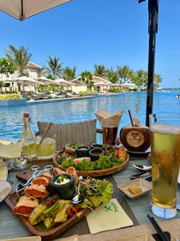 Travelers savor delectable cuisine at two on-site restaurants while enjoying refreshing cocktails at the swim-up bar near Vietnam's stunning coastline