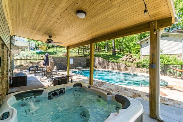 The home`s amenities include an in-ground saltwater pool**, a six-person hot tub, a Blackstone flat-top grill, a two-story game room cottage with TV room, foosball, a poker table, a two-car garage game room with ping pong, air hockey, and a Beringer pool table, as well as a fenced-in backyard for your pup and a gazebo. This listing is only for the main floor and upstairs. The basement contains 2 additional bedrooms and a bathroom but will be locked off and not rented during your stay. Everything pictured in the listing is available for you.