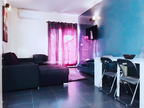 The living room is equipped with an air conditioner, a TV, a wifi box, Canal plus subscription, dining table, a convertible sofa.
