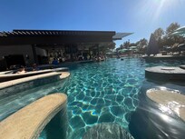 Guests can relax in style by the firepit or embrace adventure in pools with cabanas and waterslides at this Dallas retreat