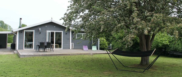 The plot is approx. 800 m² with sunny spots and shaded areas under a large tree. Plenty of space for play and relaxation. There is a charcoal grill (bring charcoal), two sun loungers, a hammock, and a sandbox. Note: Not for commercial rental.