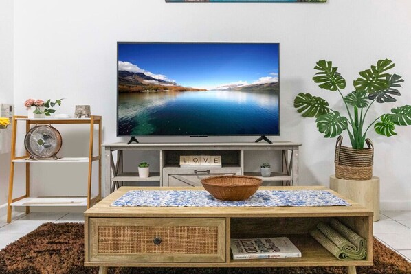Indulge in luxurious comfort as you step into our vibrant living room, featuring a plush sofa and sleek flat-screen TV, perfect for unwinding and relaxation.