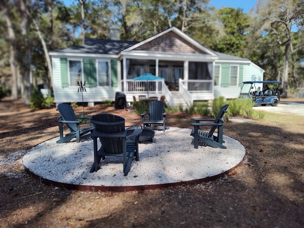 JonBie Sea Witch is where your Daufuskie dreams come true. 2 Bedroom/2 Bath stand alone Melrose Cottage. Not a duplex. Primary suite has 1 king bed and en suite wet room that includes soaking tub. Second bedroom has twin bunkbed and full bath/full laundry across the hall. Common areas includes dining for 6, wine bar, coffee station with plumbed coffee pot (no need to add water) for that perfect brew, gas-see through fireplace for cozy dining and living view. Smart TVs in Living Room and Primary Bedroom (log in to your favorite app). Outside space includes screened porch, firepit, golf cart parking. This cottage is located front row of the Melrose Cottage association and has views to ocean from front porch and wooded views to the rear. Relax to the sound and view of the Atlantic Ocean from bedroom, dining room, kitchen and living areas. A golf cart with charging station is included with your booking so you can enjoy travelling around the island. Beach chairs and beach towels are also stocked for your stay - pack light. Fully stocked kitchen: all clad cookware, service for 12 (utensils/plateware/etc.) drawer microwave, refrigerator (icemaker, water in door). Full size washer dryer (though you are on vacation and we don't want laundry to be your priority :))