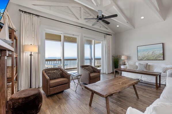 Unit 057 - 102 Surf Ct. - Summer Wave. Wow! What a beautiful new construction less than 2 years old on Dauphin Island. This gulf front beauty is ready for you and your family. Beach cottage is professionally designed with a feel of HGTV. This home boasts four bedrooms, two baths and an open living area with vaulted ceilings and kitchen. Home’s floor plan is divided by barn doors off the living area with each side offering two bedrooms, and a hall bath. Two bedrooms offer king sized beds, one with a queen and 1 with a set of full bunks. They all offer flat screen televisions. The bunk room has a dvd for the kids on a rainy day. The living room has a flat screen television/dvd player located over the electric fireplace. Dining table and bar seating for the entire family - and top of the line appliances in the kitchen. The outdoor area boasts an outdoor shower and a covered deck with 4 adirondacks, and outdoor table & chairs. This home is just steps from the shoreline - perfect for families & children.