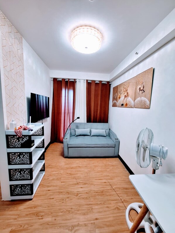 ROOM FEATURES & INCLUSIONS -Fully furnished, spacious 32.50sqm -Queen size bed + sofa bed + extra foam -Air-conditioned -40 inches SMART TV -Fast Fiber Internet 300mbps -NetFlix and Youtube -Fully-equipped kitchen (can cook w/ complete cooking utensils) -Electric stove -Rice cooker -Electric kettle -Microwave -Refrigerator -Elevator -Bathroom hot & cold shower with bidet
