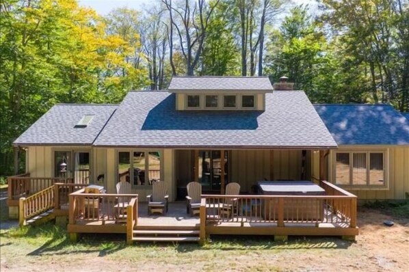 Escape to Wildlife, a serene 3-bedroom home nestled among trees on a large sunny lot. Meander through quiet country roads and unwind by the outdoor fire pit or hot tub on lovely decks. Enjoy kayaking, canoeing, or fishing at nearby Sand Run Lake with provided equipment.