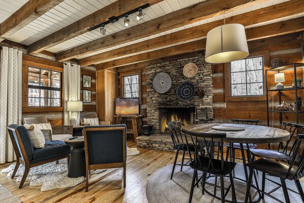 Enter the beautifully restored timber and white chink cabin through a rocking chair front porch into the open-plan dining, living area, and kitchen. The living area offers beautiful views of the wooded glen through multiple windows and a treehouse-like screened back sitting porch. Downstairs, a second living room with a TV is perfect for movie night or the game and features a stylish electric flat-screen fireplace. Behind the living room is a second screened porch sitting area, a great spot to listen to the creek or read a book. Outside, nestled at the back of the cabin, is a beautiful fire pit, perfect for relaxing and enjoying nature and the sounds of the nearby creek.