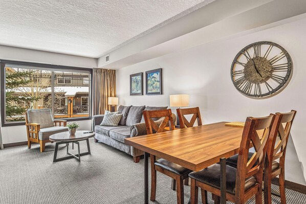 The unit provides an open concept kitchen fully equipped with everything you'll need to cook for your group or family. The kitchen provides a spacious social aspect with island bar seating & nearby dining table for 4. The kitchen also offers a coffee/tea bar to get your mornings off to a great start!