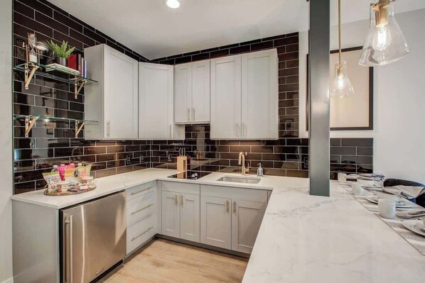 Before you drop your bags in one of the luxurious bedrooms, take in the fully stocked kitchen and linger in the hand-designed lounge area. A couch is perfectly situated near a lovely window and across from the Smart TV, which is set up for streaming. Bar seating for four and a comfy chair invite you to relax, share a laugh and make some memories!