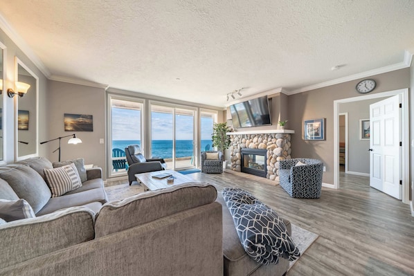 Thundering Sea is a first-floor, oceanfront condo in Depoe Bay with front-row whale watching right from your private balcony and cozy evenings by the river rock gas fireplace. Updated in 2025 with two handicap-accessible walk-in showers (no bathtub), it’s a comfortable, modern retreat for up to four guests with fast Wi‑Fi, Smart TVs, and access to the on-site pool and clubhouse amenities.