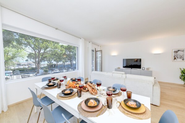 As soon as you cross the threshold, you are welcomed by a bright and relaxing atmosphere: the spacious open space harmoniously combines the American kitchen, dining area, and living room, enriched by a large corner sofa that transforms into a comfortable double bed when needed. A scenic glass wall frames the lake view and lets in the morning light, while the lakefront balcony allows you to immerse yourself in the vitality of the center and enjoy life as it flows.
