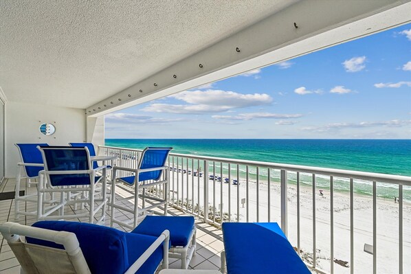 Step in and unwind in this completely redesigned 2 bedroom/2 bath Gulf-front condo. You won’t find a better spot than your 30’ private balcony to enjoy the stunning views of the Emerald coast. Located on the 6th floor this condo has everything you need and more. The private balcony can be accessed by way of the living room or master suite. Entering the master bedroom, you will find a king size bed with an attached fully renovated bathroom, to include walk-in shower. The guest room has plenty of space for everyone with two queen size beds to choose from. The kitchen has been completely updated to include cabinets, granite and stainless steel appliances. In the wet bar you will find a separate ice maker, perfect for filling up your cooler on the way to the beach. Need to do some laundry? No problem! This unit has a full-size washer and dryer in the laundry room. There is a reserved, covered, parking space in the garage. This unit offers free beach service March 1st through the Sunday after Thanksgiving. (Monthly reservations do not receive complimentary beach set-ups.)