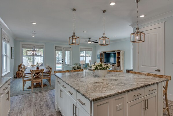 The open Great Room of Destiny Awaits is on the ground floor level and incorporates the living, dining and kitchen portions of this spacious hospitable property. This area has a comfortable casual look with beach washed hardwood flooring and pale sky blue interior walls that evoke a serene ambiance. Decorative art includes giant hand-carved sculptures of sea life. A plush cloth couch, love seat and an accent chair with striking striped patterns face the pool along with a large credenza that houses a TV for entertainment. An adjacent dining room area has eight criss-cross backed maple chairs around a charming rustic country table. A convenient powder room is right off the living area. The centered kitchen nearby features all au courant state of the art appliances and a cream based gray misty veined marble island with six raised maple chairs that sit beneath three hanging coach lanterns. One of the Guest Bedrooms with a king-sized bed and en-suite bath is on the first floor with access to the front veranda.