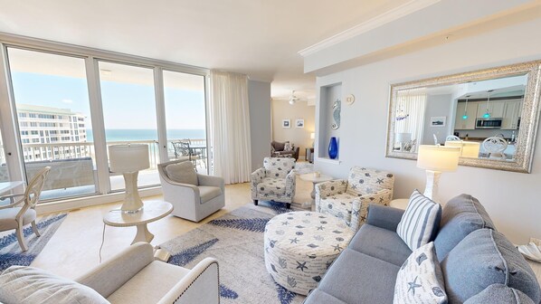 The kitchen is spacious and full stocked with all the cookware and utensils you need to make a family feast or a quick bite before heading downstairs to the pool or beach. The living room has plenty of comfortable seating options to enjoy the gulf view. There is a private Den area off the living room that features a large flat screen TV and additional seating.