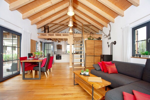 A healthy climate is created by oak floorboards, an open roof truss with natural beams, a mountain larch rhombus façade and solid wood furniture. The oak steel staircase takes you to the gallery in the bedroom, which is ideal for 2 adults, max. for a family with 2 children. In the finely designed bathroom with window you will find all the comforts with towels and hairdryer.