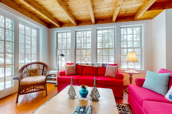 This two-story home is what you think of when you picture Vermont - a charming exterior, wide-plank wood floors, exposed ceiling beams, and picturesque views through generous windows. On summer days, explore the creek below, light the gas grill for afternoon barbecues, and linger on the deck in the fresh forest air. Come winter, curl up by the gas fireplace in the sunroom, pull a good book from the shelves, or set up a board game as a movie streams in the background.