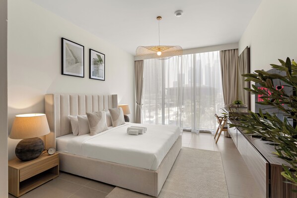 Step out onto your private balcony and take in breathtaking views of the city skyline, including the iconic Burj Khalifa. It’s the perfect spot for enjoying a morning coffee or an evening glass of wine.