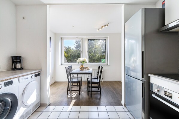 Are you traveling as a family, with friends, or on business? Here you will find plenty of space for everyone and the perfect combination of comfort and location. Free Wi-Fi, a fully equipped kitchen with dishwasher, washing machine, and dryer are available at all times. Start your day relaxed with a Nespresso coffee machine. Toiletries, fresh towels, and bed linen are included—just bring your suitcases and make yourself comfortable! Right outside, you can explore the old town, the Philharmonic Hall, and the Duisburg Theatre. The main railway station and the modern inner harbor are a 10-minute walk away. The exhibition center is conveniently located 25 minutes away by car, and the airport is only 18 km away. We look forward to providing you with a relaxing stay in Duisburg.