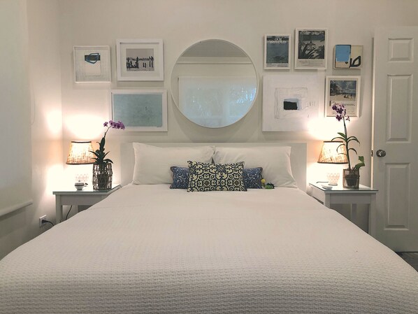 Bamboo House is a fully renovated mid century cottage in the heart of the village. It is set within a completely enclosed private tropical oasis comprising a main house with 2 bedrooms and a separate shared bathroom, and two separate guest cottages each with en suite bathrooms. Each of the four bedrooms are outfitted with queen beds, ample storage / closet space and double glazed sound proof sash windows with solar shades. Each of the bathrooms are bright and modern, and outfitted with Kohler fixtures. The kitchen is fully equipped with white quartz countertops, Kohler fixtures and Bosch appliances - plus various coffee making options including a Nespresso machine. This quaint village home has been tastefully decorated in a perfect blend of contemporary modern style and timeless island charm. Lush outdoor tropical gardens surround the cottages and include an outdoor shower and many opportunities for relaxing and al fresco dining. Bamboo House is located on the busy end of Dunmore Street close to the intersection with Clarence Street - which is home to the famous license plate wall. Bamboo House is also equipped with a 24 hour standby generator to ensure uninterrupted power supply during your vacation. In March 2025 another 120 gallon hot water tank was added to ensure ample hot water supply for all guests.