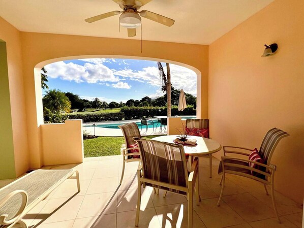 Nestled on the prestigious Barbados Golf Course, this charming two-bedroom, two-bathroom apartment called “Island Time”, offers the perfect blend of comfort and tranquillity. With its ground-floor location, you’ll enjoy easy access to the stunning lagoon-style pool, which is just steps from your patio. From here, take in sweeping views of the lush golf course – ideal for sipping your morning coffee, during afternoon tea, enjoying a leisurely evening drink or any meal.