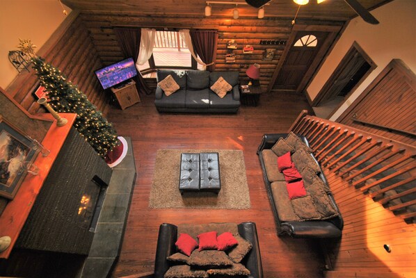 The Living Room was conceptualized and designed custom. It is equipped with an 20ft HIGH ENORMOUS 4000 BTU GAS FIREPLACE. The fireplace can easily heat the 2nd and 3rd floors so use it wisely. It was made to share the look and the feel of a modern yet rustic log home.