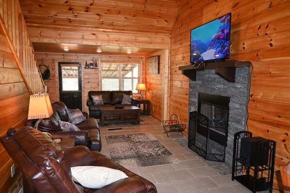 This beautiful cabin is the perfect getaway for those seeking a peaceful retreat in nature overlooking the woods which many deer, turkey, and other wildlife call home. With four cozy bedrooms and three bathrooms, it can comfortably accommodate up to 12 guests. The cabin is designed with a rustic feel, featuring natural wood accents and warm, inviting colors that create a cozy and relaxing atmosphere. The living room is the heart of the cabin, with a comfortable couch, loveseat and armchair situated around the fireplace, perfect for cozying up on chilly evenings or streaming on the 55-inch smart TV. The fully equipped kitchen has everything to cook up a delicious meal for your group, with modern appliances and ample counter space. There's also a dining area with a large wooden table, perfect for family meals or board games. Challenge a friend or family member to a competitive game of Foosball or catch the big game on the 55-inch Smart TV in the Game Room on the lower-level.