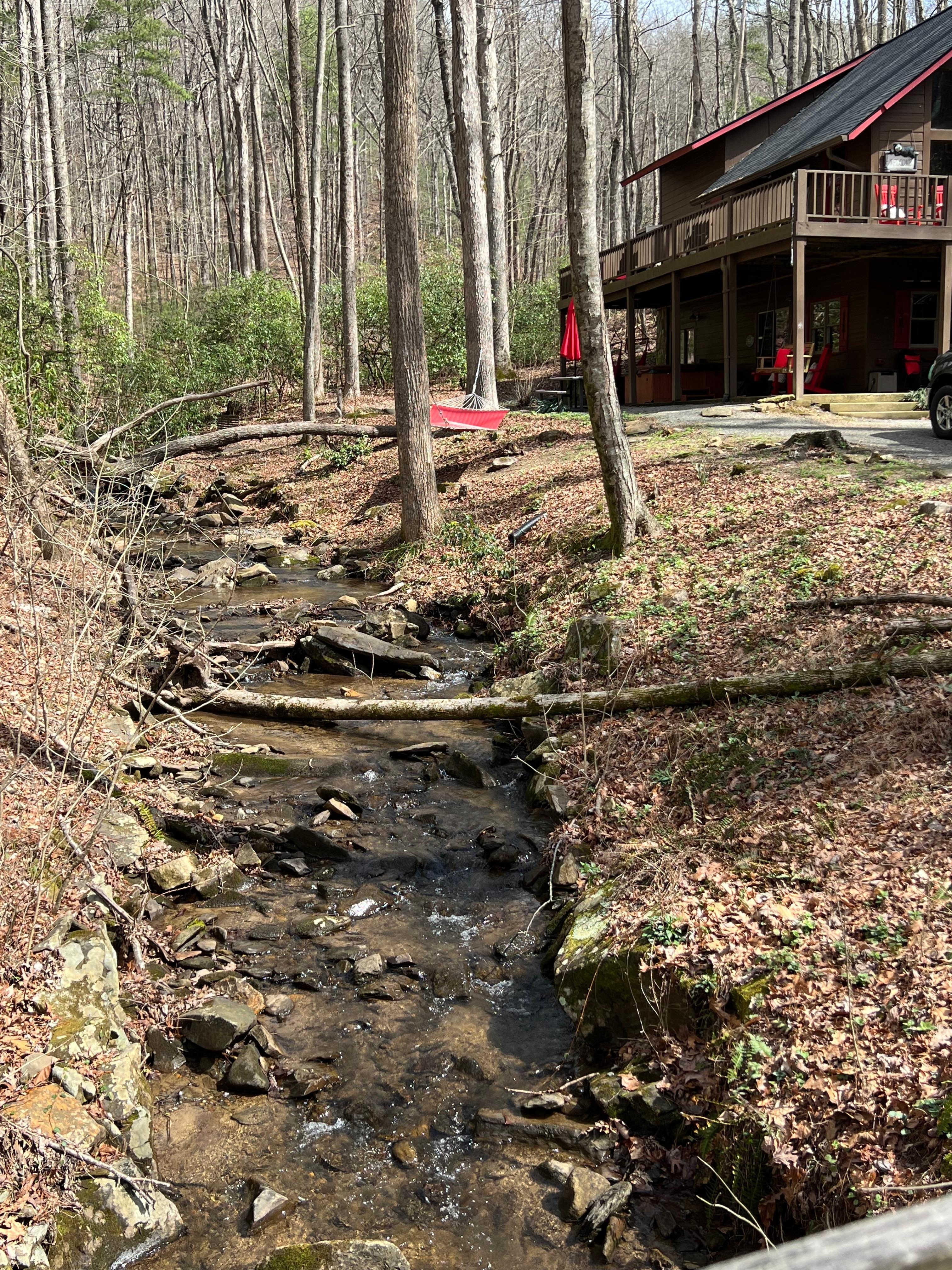 Step outside and immerse yourself in the serene beauty of nature. Sway in the trees' embrace, soak in the private hot tub while gazing at the stars, or take a short stroll to a stunning waterfall. A gentle creek trickles nearby, adding to the peaceful ambiance. The wraparound deck is perfect for enjoying sunrises and sunsets, while the community offers hiking trails, scenic lakes, and tennis courts.
