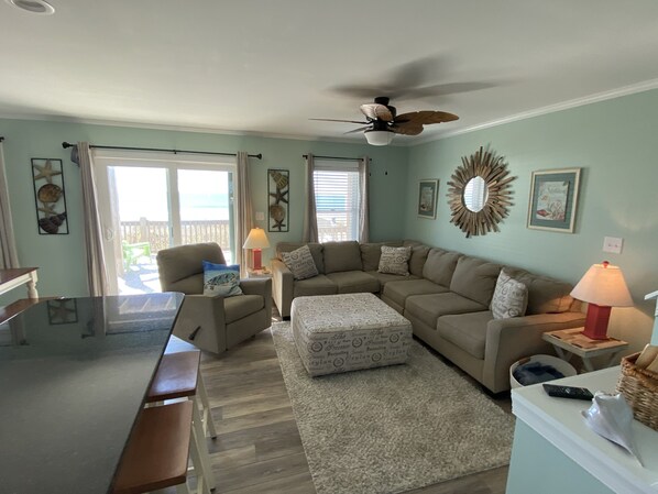 Your fully renovated half duplex beach cottage provides a perfect stay for guests leaving no comfort ignored. You are steps from the beach allowing you to watch the birds soar, and dolphins jump while the kids swim, fly kites and build sandcastles. Eat breakfast on the deck while watching the sunrise or enjoy your favorite cocktail and catch the most spectacular sunsets anyone could imagine. Bring your pole and try your hand at some surf fishing. Completely remodeled inside and out this 4 bedroom and 2 bath, half duplex provides you the perfect oceanfront getaway. An open kitchen, dining, and living area compliment the master bedroom with a queen bed and full bath on the first floor. The 3 bedrooms with queen beds and a full bath upstairs include 2 oceanfront rooms with a private deck. 5 flat-screen Roku smart TVs allow the family to chill out on those rainy day breaks or curl up for a night in watching a family favorite. Stainless steel appliances, granite countertops with custom backsplash, and luxury vinyl plank throughout complement the beautiful beach views you will find from every room. The oceanfront decks offer a table and 4 chairs for dining as well as ample seating to lounge in the sun or to read a good book. We offer an under house 12 x 14 patio for grilling and entertaining which includes a gas grill, picnic table, patio chairs and family games. If you choose you are only 2 blocks from the sound where you can launch paddleboards and kayaks for a day of paddling or fishing adventure. You can launch boats or jet skis from several near by public ramps.