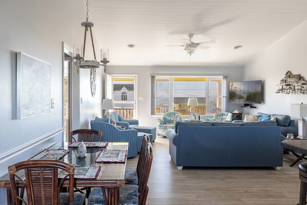 Level One: Large Living Area has Cathedral Ceilings and flat screen TV. Dining Area. Kitchen/bar has a dishwasher and microwave. Oceanfront Bedroom #1 has a Queen Bed with flat screen TV, an open deck and a private Bath. Oceanfront Bedroom #2 has a Twin Double Bunk Bed. Streetside Bedroom #3 has a Queen Bed. Streetside Bedroom #4 has 2 Twin Beds. (Bedrooms #2, #3 and #4 share a bath). Central Heat and Air. Washer/Dryer. Ceiling Fans. In-ground Charcoal Grill. High Speed Wireless Internet Provided!