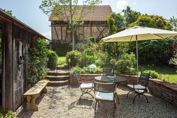 Here you can expect a charmingly furnished vacation apartment, which with its historical building elements reminds you of an earlier time and at the same time has been lovingly renovated. The tiled stove and the ceiling beams provide a cozy living atmosphere. In the courtyard you will find a beautiful seating area, which invites you to linger. Also discover the beautiful garden to unwind there with a glass of wine and a good book. WLAN, dishwasher, coffee maker, TV, sterio equipment are available. Washing machine and dryer are also available in the boiler room and can be used with pleasure.