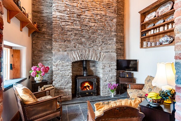 The sitting room has a wood burning stove and a floor to ceiling feature fireplace behind. The couches and armchair are weathered and comfy and the perfect place to curl up with a good book or snuggle up and watch your favourite movie. If you want to simply sit and relax, your eye will be drawn upwards to the wooden shuttered window and the shelves below which feature an array of interesting collectables.