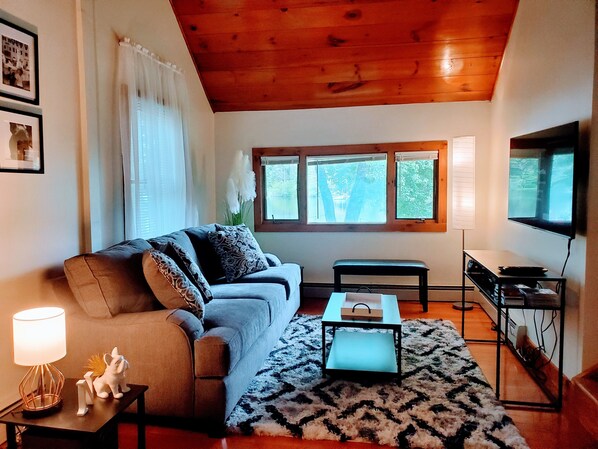 This lakeside house is located on Chestnut Pond, a tranquil, relaxed, family-friendly pond perfect for swimming, kayaking, canoeing, paddleboarding, and fishing. The house sleeps four (4), featuring sought-after amenities, including a deck, a grill, and kayaks.