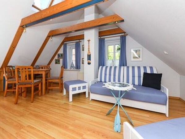 Size: approx. 50 square meters Living room with spatially separated kitchen Bedroom Bathroom with shower, vanity and toilet Ground floor First floor Terrace optimally for 2 to 3 persons Washing machine in the apartment available, use free Clothes rack DVD player Board games Barbecue available Cot and highchair free Wifi free On If you wish, you can clean the accommodation yourself on arrival, then there is no cleaning fee.