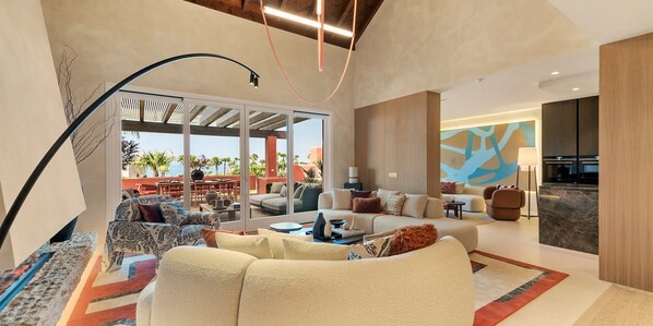 The exquisite interior of the Signature Penthouse sleeps up to 8 people with four bedrooms and three and a half bathroom, where modern elegance meets exceptional design. One of the bedrooms, the master, has its own en-suite with marble details, freestanding bathtub, and a bespoke walk-in wardrobe. The open-plan living area showcases a brand-new kitchen and bathrooms outfitted with the highest quality brands. Enjoy generous sitting and dining spaces with soaring ceilings and breathtaking sea views. Sophisticated touches include a concealed TV with a Bang