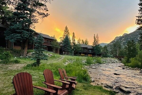 This large 2-bedroom, 2-bathroom unit features a Master bedroom with King bed and master bathroom with an over-sized jetted tub and shower combo. The upstairs bedroom has a Queen bed and a private bathroom with shower. The living area has a Queen sized Sleeper Sofa facing a cozy gas log fireplace. It also features a flat screen t.v. with cable and a dvd player. The large kitchen is fully equipped for all of your needs! There is an adjoining dining room with table and chairs to share meals with your family. Your private deck has it's own gas grill and patio furniture overlooking Fall River. You will most likely see Elk, Deer, Bighorn Sheep, Marmots and other wildlife while you are here. We also offer WiFi, free river fishing, games and movies. Enjoy the beauty and sounds of gorgeous Fall River!