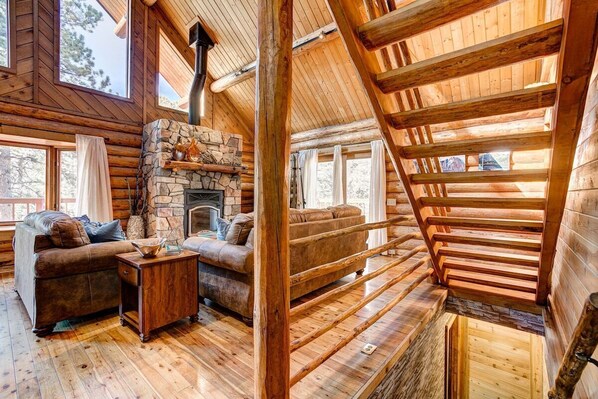 Enjoy a true log cabin with amazing views! The spacious great room is excellent for the gathering of family and friends around the stone fireplace. The kitchen is open-concept with an island. Off the kitchen is the dining table that seats 8 . A private space for reading and relaxing is available in the upstairs loft. There is a Queen bed in the primary bedroom and a Queen bed in the first floor bedroom. The “kids” room has a bunk bed with a Twin on top, and a Full on the bottom. There is a futon sofa in the walkout basement game room. Located in primary closet, there is a pack n’ play available for your use. The refinished walkout basement provides an excellent entertainment space with game tables, another TV and a gas fireplace, as well as an extra sleeping space for two. There are solar panels on the roof to help capture carbon-neutral energy from the glorious Colorado sun, as well as air exchange heat pumps that provide carbon-neutral warm or cool air and quietly circulate it around the house. Take in the stunning views and fresh mountain air from the large deck. Come and enjoy your Colorado dream vacation in this wonderful log home!